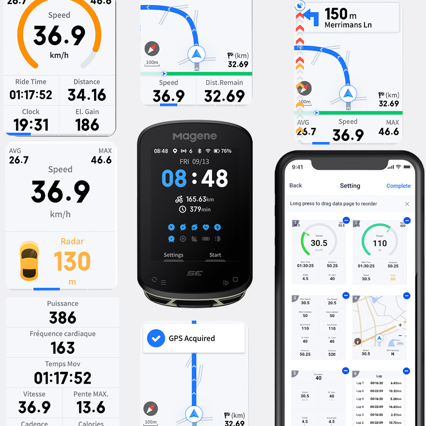 | Dispositivos compatibles | Sensor de velocidad, sensor de cadencia, monitor de frecuencia cardíaca, medidor de potencia, rodillo inteligente, luz trasera con radar, luz trasera inteligente, sistemas de cambios electrónicos SRAM eTap y Shimano Di2 |